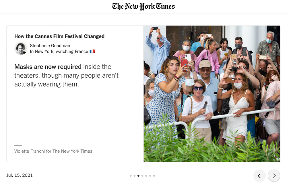 How The Cannes Film Festival Changed (online article - 07/15/21)'The Cannes Film Festival returned after a year off. Unlike other festivals, which went online during the pandemic, Cannes organizers had vowed to wait until an in-person event was possible. All is not exactly back to normal.' (Stephanie Goodman)